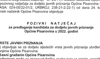 POZIVNI NATJEČAJ za predlaganje kandidata za dodjelu javnih priznanja Općine Pisarovina u 2022. godini