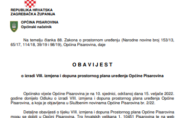 Obavijest o izradi VIII. izmjena i dopuna prostornog plana uređenja Općine Pisarovina